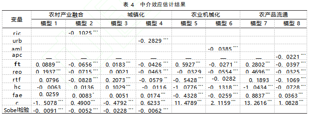 在验证了金融科技发展有助于改善城乡收入差距的基础上,进一步从农村产业融合、城镇化、农业机械化、农产品流通四个维度(表4)进行作用机制检验。